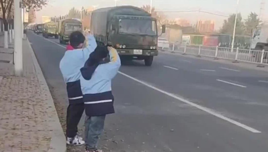 小學(xué)生遇軍車駐足敬禮 解放軍戰(zhàn)士鳴笛回禮